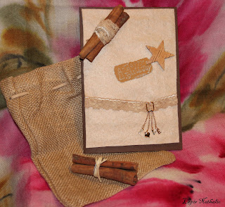 В работе использовались кардсток, фетр, палочки корицы, звёздочка из дерева, цепочка с надписью "Love". Кружево состарено с помощью чая с корицей.